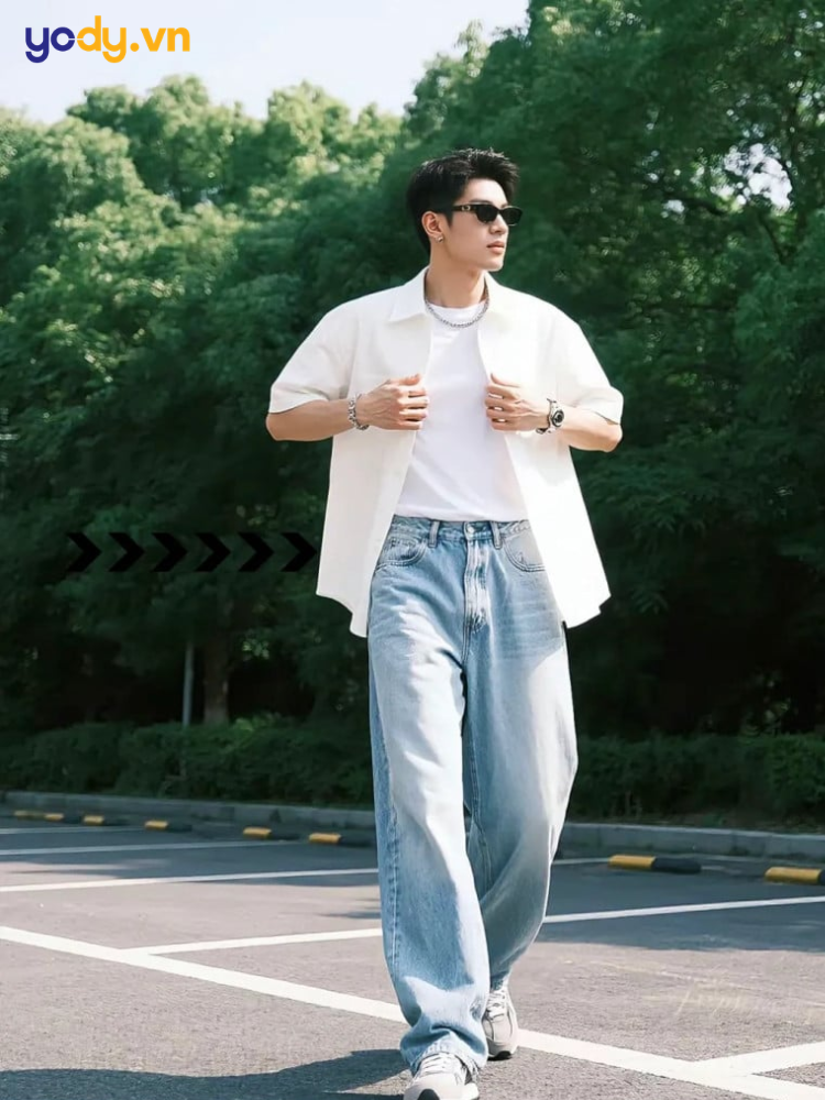 2.5 Phối quần jean ống rộng nam, áo sơ mi denim