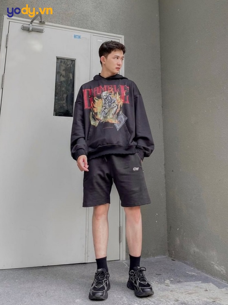 Sự kết hợp giữa quần short và áo hoodie hoặc sweater là lựa chọn hoàn hảo cho những ngày thời tiết se lạnh hoặc khi bạn muốn theo đuổi phong cách đường phố trẻ trung. Đây là một ví dụ điển hình của việc phối đồ high-low, kết hợp một item mùa hè (quần short) với một item mùa thu. Để hoàn thiện set đồ, hãy mang một đôi giày sneaker hầm hố và thêm các phụ kiện như mũ len hoặc túi đeo chéo.