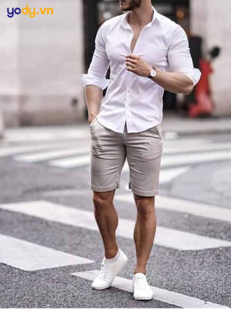 Áo Sơ Mi Dài Tay | Lịch lãm, lãng tử | Quần short kaki/tây + giày tây hoặc loafer | Hẹn hò, tiệc nhẹ, buổi gặp bán trang trọng |