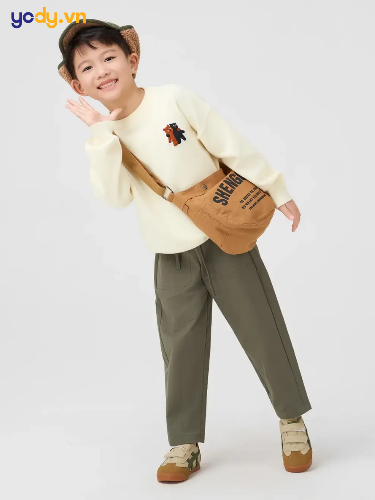 Chất liệu quyết định cảm giác mặc. Những loại vải ít co giãn như kaki, denim dày hoặc thô cotton sẽ ôm sát hơn khi vận động. Trong trường hợp này, tăng thêm một size giúp bé thoải mái chạy nhảy mà không bị căng ở vai, bụng hoặc đùi. Ngược lại, chất vải có độ đàn hồi tốt sẽ linh hoạt hơn và có thể chọn đúng size tiêu chuẩn.