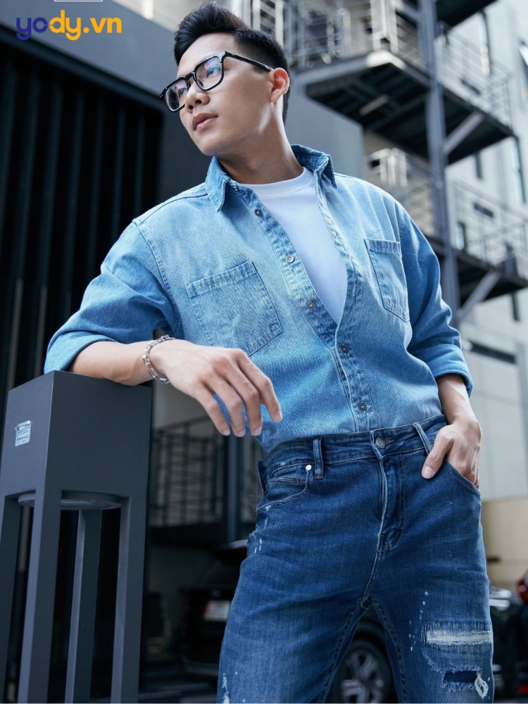 Công thức denim-on-denim chưa bao giờ hết hot. Áo sơ mi denim khi mix cùng quần jean tạo nên phong cách đầy nam tính, cá tính và bụi bặm. Để set đồ không bị “dừ”, hãy chọn áo và quần có tông màu denim khác nhau, ví dụ: áo denim sáng + jeans xanh đậm hoặc ngược lại.
