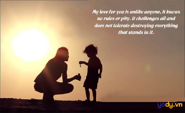 Dịch nghĩa: Tình yêu của mẹ dành cho con không giống bất kỳ điều gì khác trên thế giới. Tình yêu đó không có luật lệ và không có hối tiếc. Tình yêu đó dám đương đầu và làm tan chảy mọi thứ trên đường lan tỏa của nó mà không chùn bước.