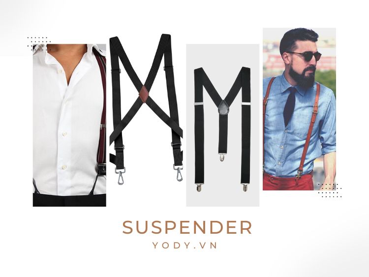 Suspender, còn gọi là dây đeo quần, có hai dạng chính: Suspender Button và Clip-on Suspender.
