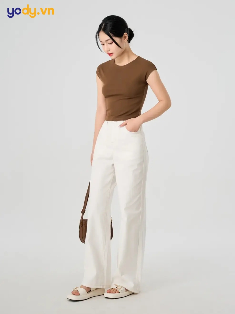 Quần tây ống loe/suông + áo sơ mi hoặc áo thun trơn: Bộ đôi cổ điển giúp tạo hiệu ứng chân dài, thon gọn và sang trọng tức thì.