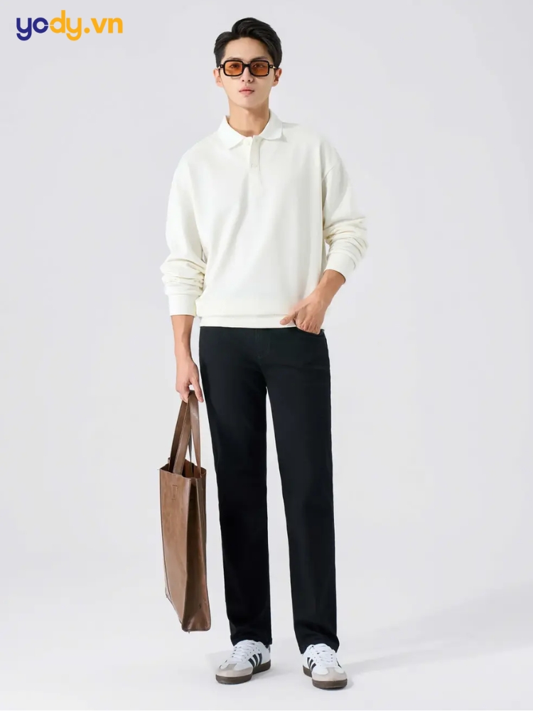 Áo polo đơn sắc + quần trắng/quần sáng màu: Thoải mái nhưng vẫn lịch sự – dễ áp dụng cho cả đi làm hay đi hẹn hò.