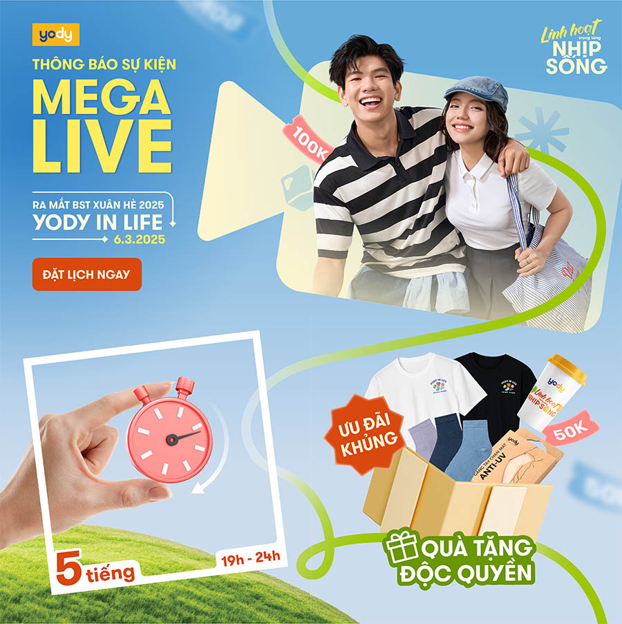 Kính mời Quý khách hàng đánh dấu thời gian và đón xem MEGA LIVESTREAM từ 19 giờ 00 phút đến 24 giờ 00 phút, ngày 06 tháng 03 năm 2025 trên trang Facebook chính thức của YODY: [Fanpage Facebook YODY Official]