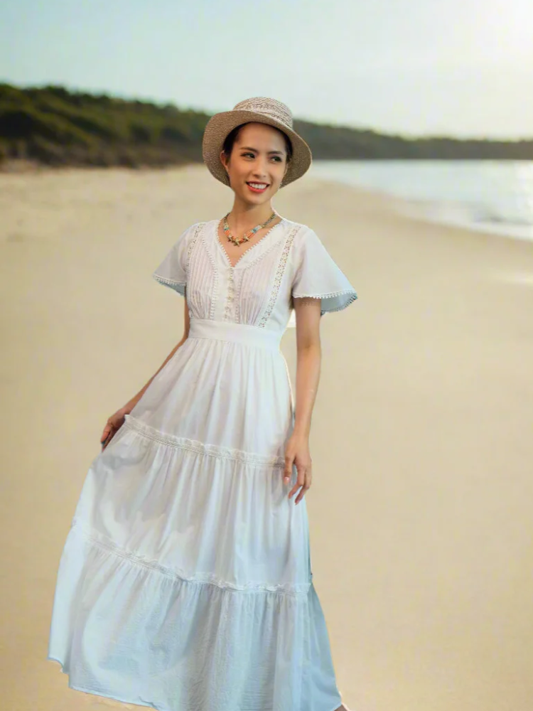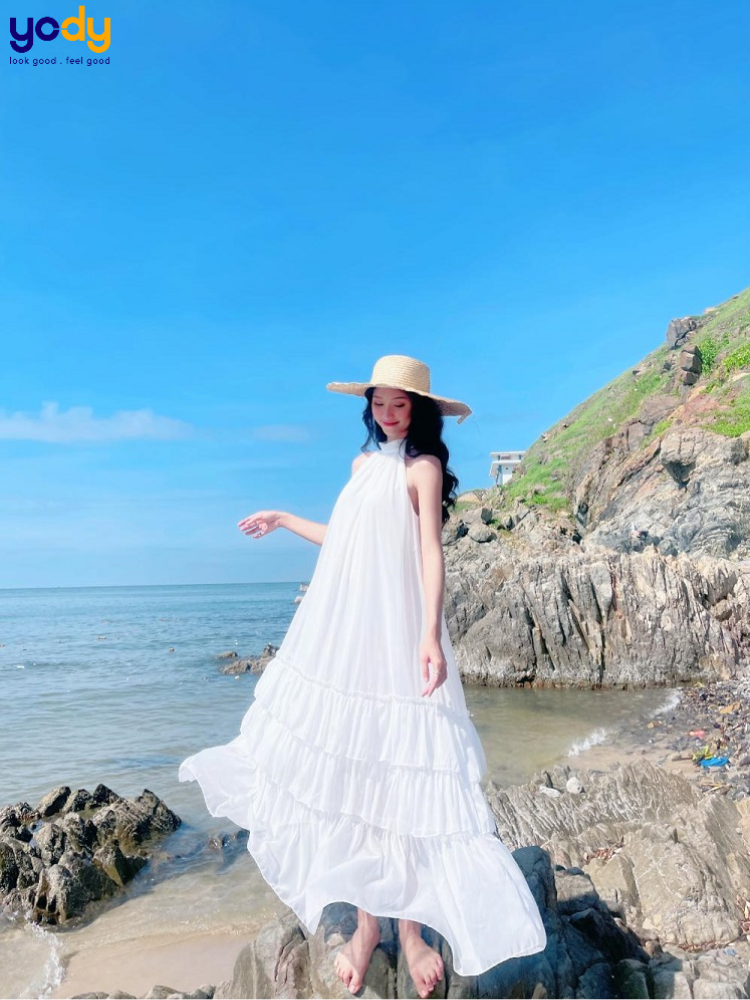 Đầm maxi cổ yếm hoặc tay bồng: Thiết kế dài thướt tha giúp che chắn tốt dưới ánh nắng, đồng thời tạo hiệu ứng bay nhẹ trong gió biển. Phần cổ yếm tôn vai thanh mảnh, còn tay bồng mang lại nét dịu dàng, lãng mạn đúng chất nàng thơ mùa hè.
