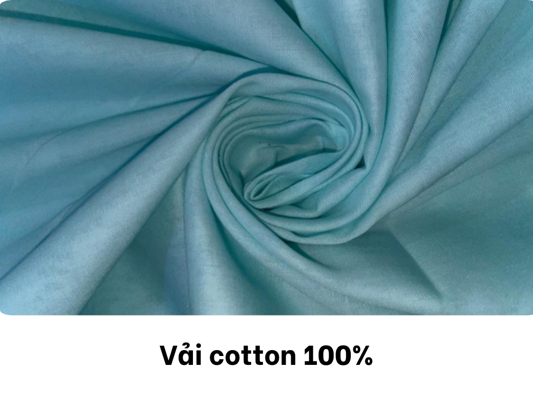 Vải cotton 100% là loại vải được dệt hoàn toàn từ sợi bông nguyên chất, không pha trộn với bất kỳ loại sợi nhân tạo nào. Nhờ có nguồn gốc từ tự nhiên, chất liệu này nổi bật với khả năng thấm hút mồ hôi tốt, mềm mại và an toàn cho làn da, phù hợp với mọi lứa tuổi.