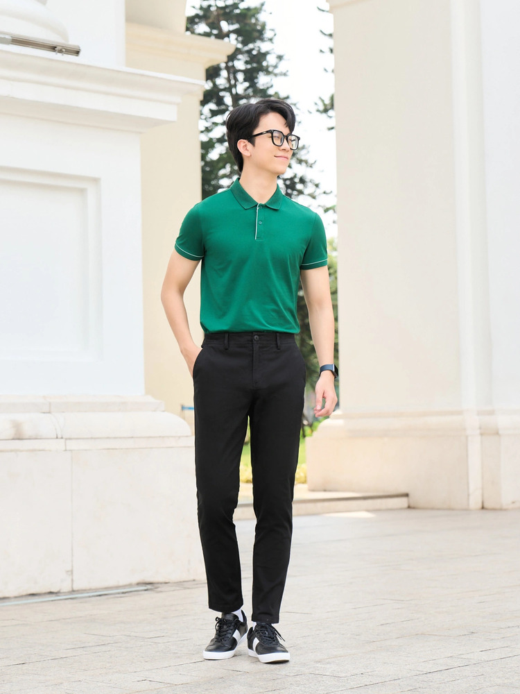 Phong cách: Một chiếc Polo Pique mắt chim đứng form màu trung tính (Xanh Navy, Be, Xám) phối cùng quần Kaki ống đứng. Set đồ này mang lại vẻ ngoài năng động, trẻ trung nhưng vẫn đủ lịch sự để bước vào bất cứ nhà hàng nào.