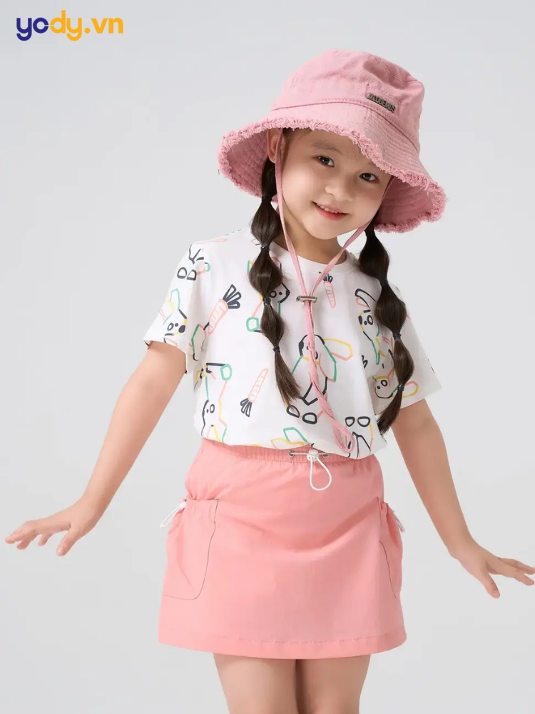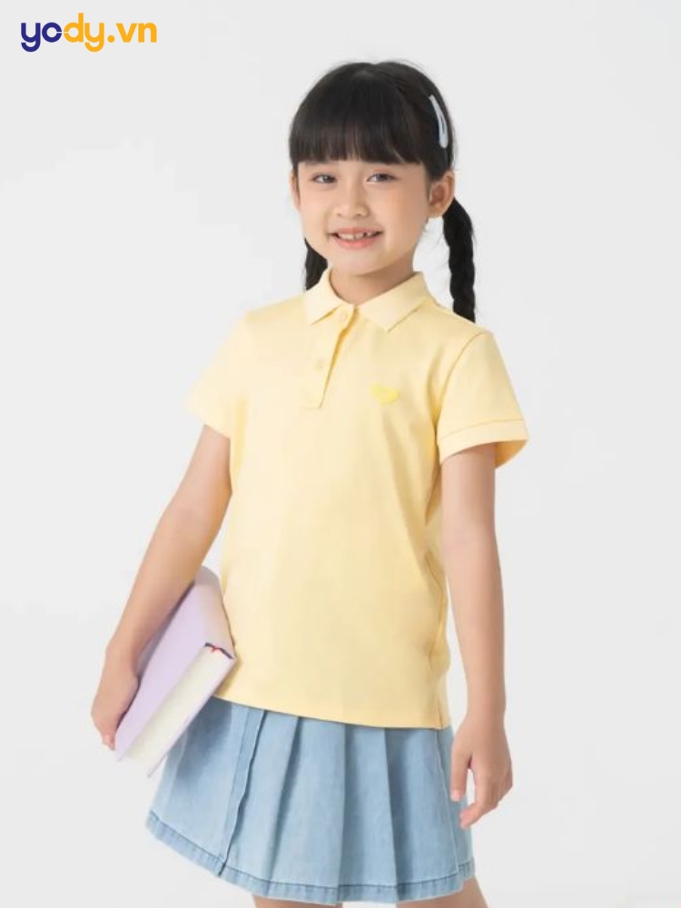 Với áo thun: Chọn áo thun vừa vặn, màu sáng, họa tiết nhẹ nhàng. Kết hợp cùng giày bata hoặc búp bê, bé có ngay set đồ đáng yêu để đi học, đi chơi hay dạo phố. Chân váy jean hoặc sọc dọc sẽ càng tôn vẻ năng động.