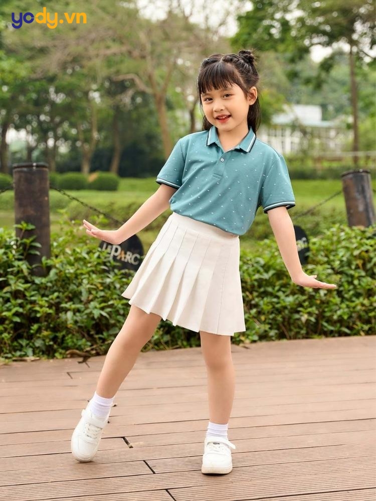 Chân váy xếp ly luôn mang đến sự bồng bềnh dễ thương, phù hợp cho bé đi học lẫn đi chơi.