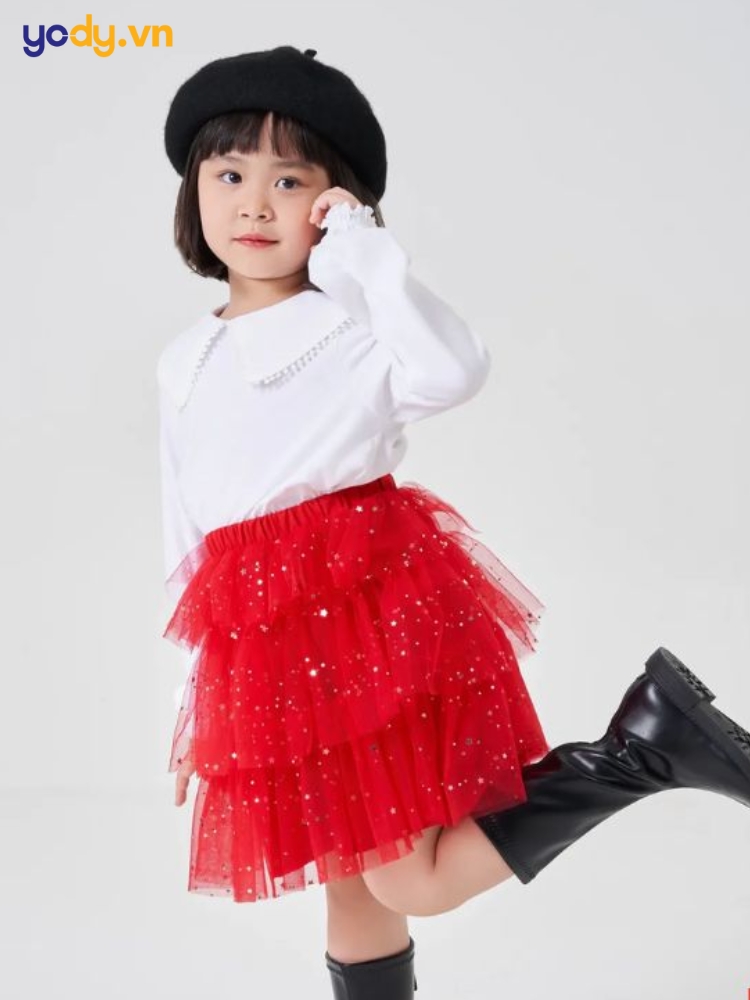 Chân váy xếp tầng: Gồm nhiều lớp vải chồng lên nhau, tạo độ phồng tự nhiên, giúp bé trông vừa ngọt ngào vừa nổi bật. Kiểu váy này đặc biệt được các bé yêu thích nhờ sự nữ tính và điệu đà.