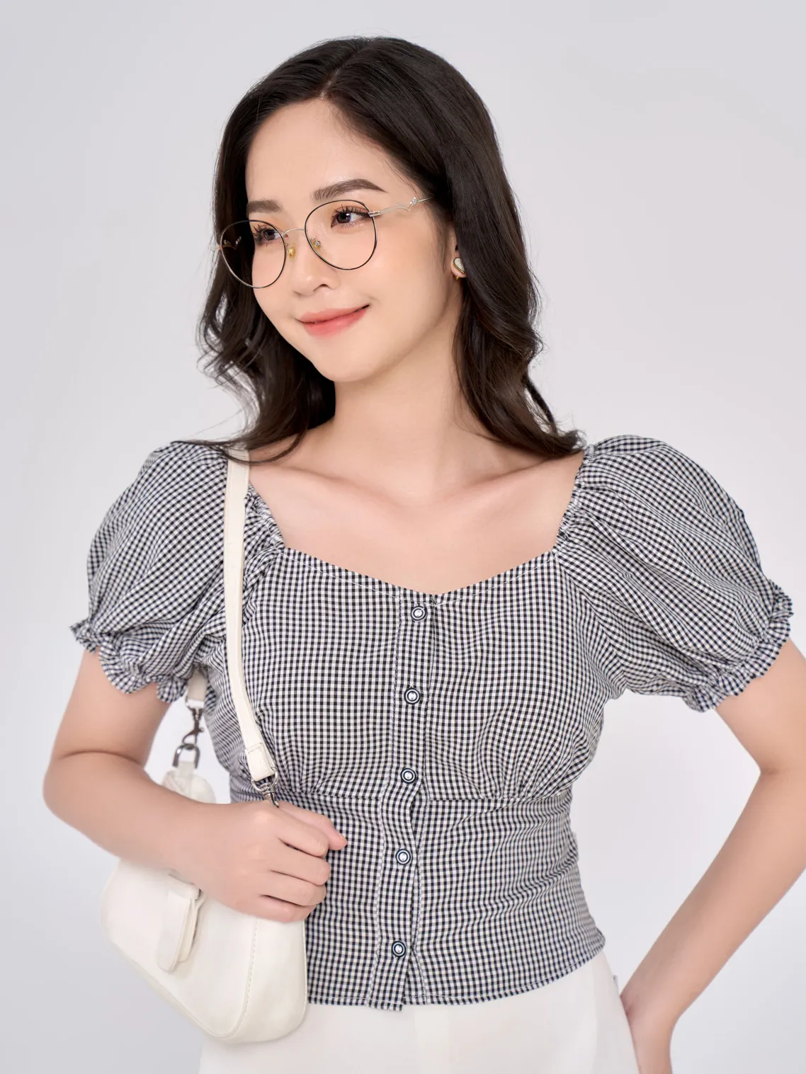 Áo Croptop Tay Ngắn Phồng Họa Tiết Gingham