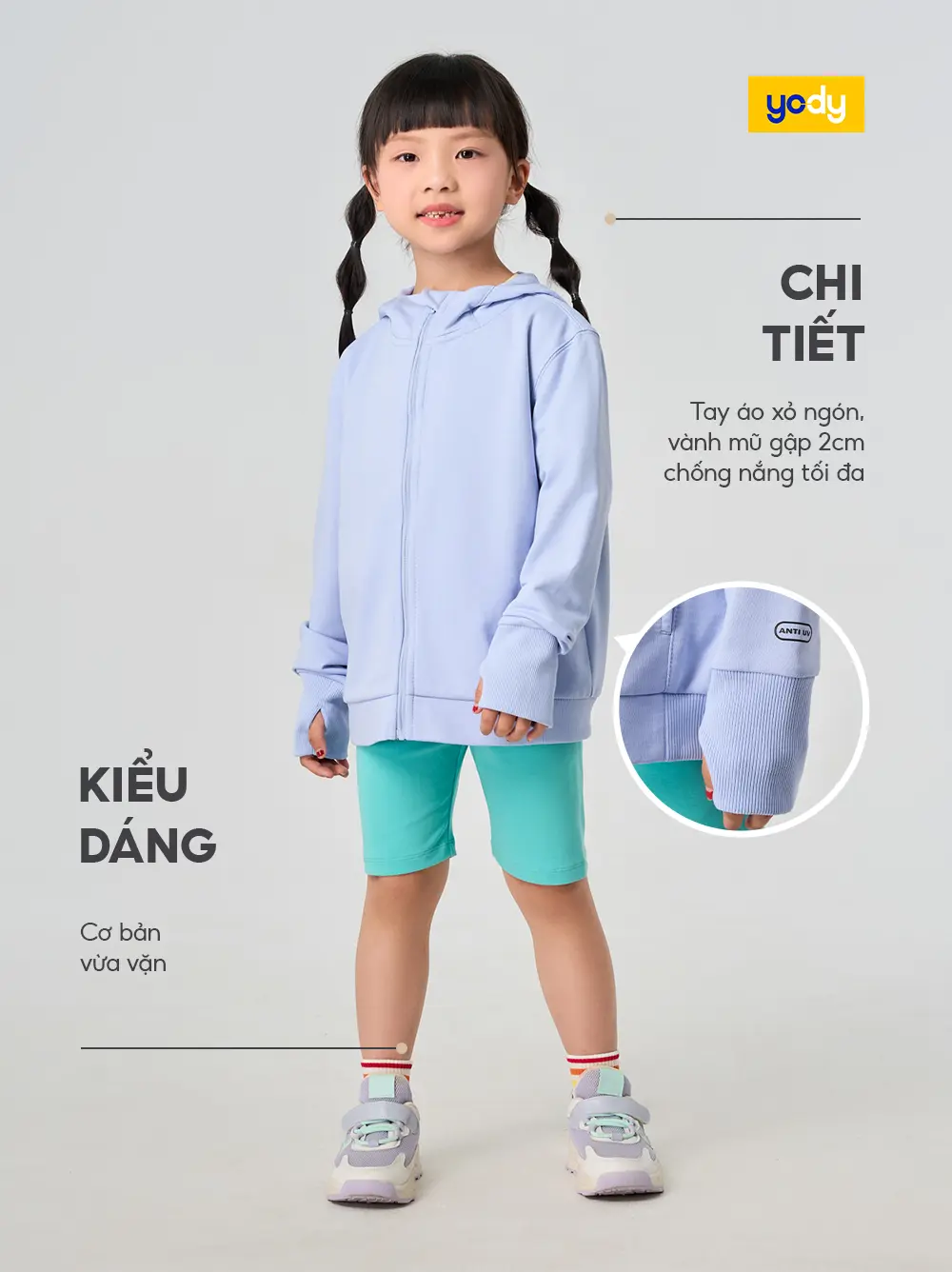 Chống UV hiệu quả: Bề mặt vải ứng dụng công nghệ hoàn tất UV, giúp bảo vệ làn da bé khỏi tác động của ánh nắng mặt trời khi hoạt động ngoài trời.