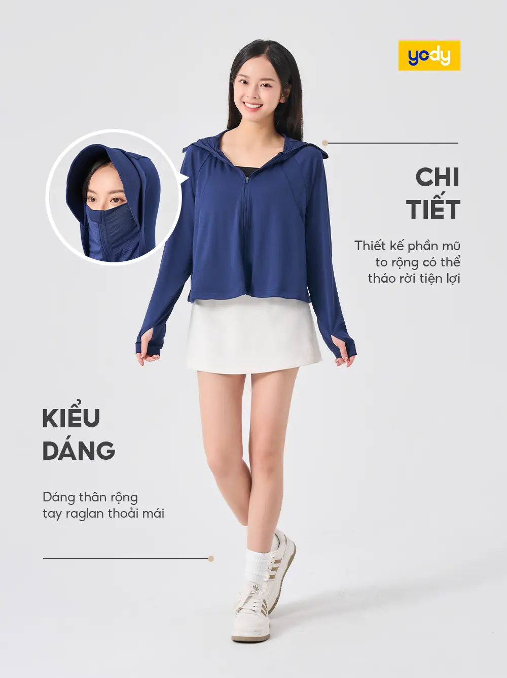 Bảo vệ toàn diện: Mũ rộng, tay dài che chắn tốt; cổ cao tăng khả năng chống nắng; lưỡi trai có thể tháo rời.