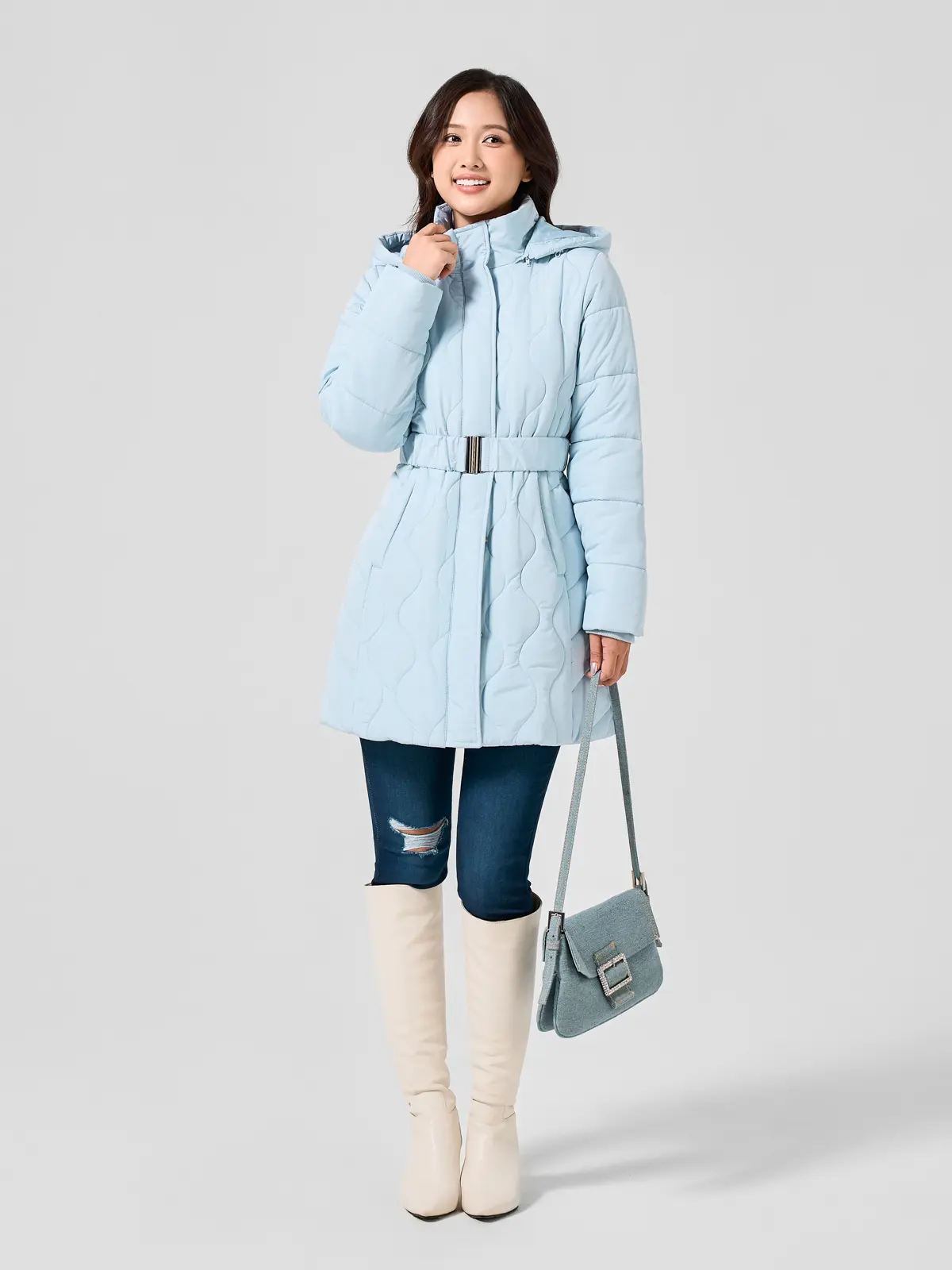 Áo Phao Nữ Dáng Dài Lỡ Trần Sóng Mũ Rời