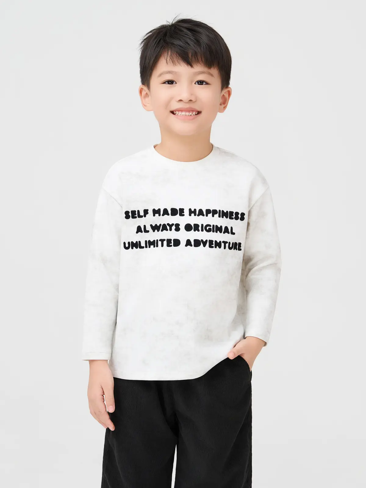 Hiệu ứng nhuộm loang độc đáo, kết hợp hình in chữ ép nhung nổi bật tạo điểm nhấn thời trang.