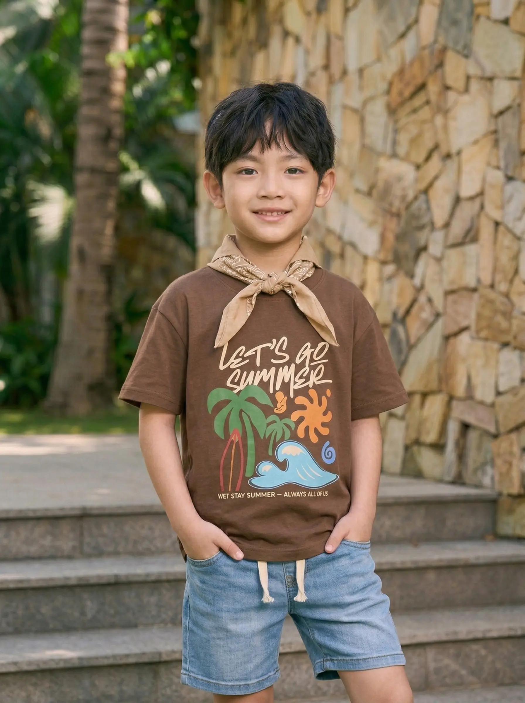 - Graphic Ngộ Nghĩnh: Hình in sinh động với những biểu tượng mùa hè (sóng biển, mặt trời, cây dừa) giúp bé thêm hào hứng với các chuyến đi. Những gam màu nổi bật trên nền vải nâu trầm ấm tạo nên vẻ ngoài vừa hiện đại, vừa đáng yêu.