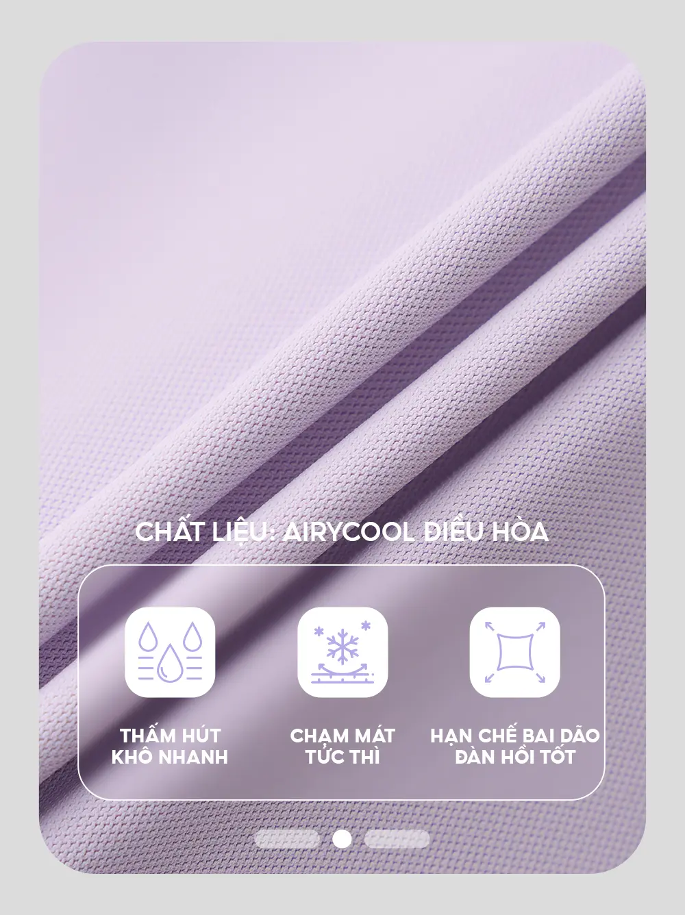 Thấm hút nhanh, khô nhanh: Vải được xử lý bằng công nghệ “HÚT NƯỚC TỰ ĐỘNG”, giúp thấm hút nhanh hơn cotton 100% và khô siêu nhanh, không gây bí và nặng khi đổ mồ hôi