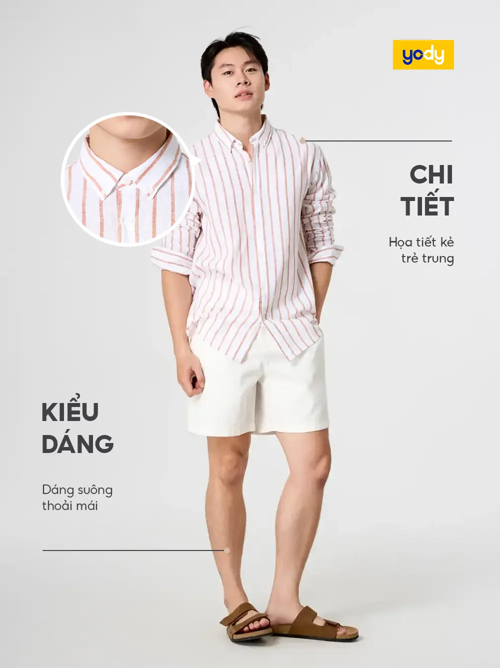 Cuối tuần năng động: Phối với quần short kaki hoặc jeans, xắn tay áo và mang sneakers trắng cho phong cách trẻ trung, thoải mái.