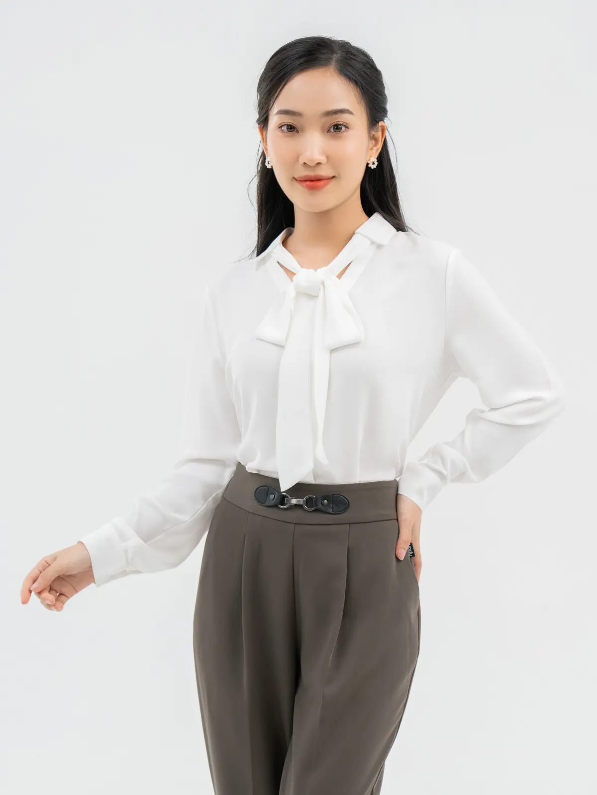 Áo sơ mi tay dài dáng suông kèm nơ thanh lịch. Vải không bị nhăn và tạo nếp gấp, dễ bảo quản. Mát mẻ, thông thoáng, toát lên vẻ sang trọng, dịu dàng cho người mặc. Thích hợp mặc công sở