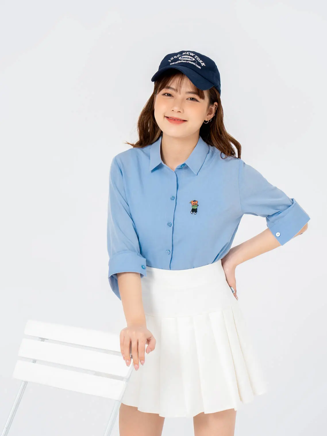 Áo sơ mi nữ tay dài dáng suông ngực thêu gấu