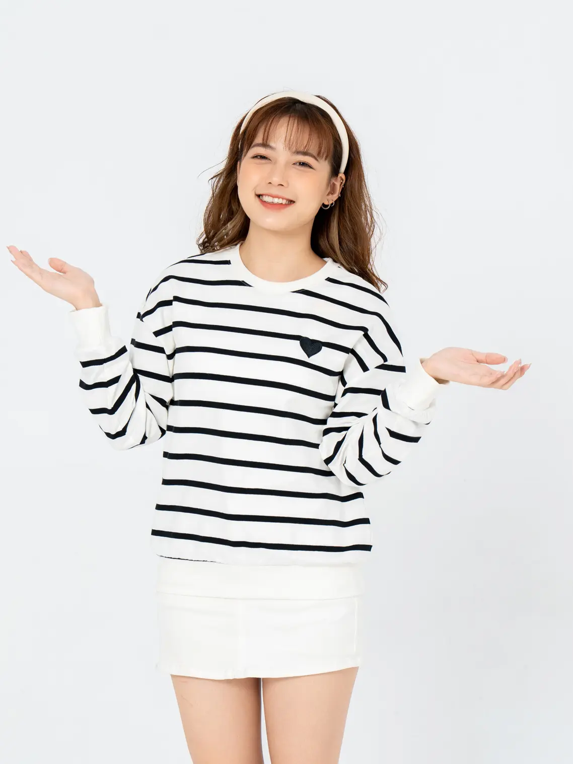Hoạ tiết kẻ ngang cùng hình thêu trước ngực mang lại điểm nhấn trẻ trung, hiện đại