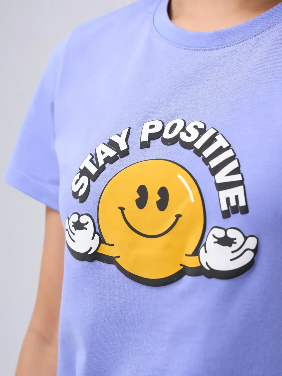 Áo thun nữ Cotton họa tiết mặt cười, chữ STAY POSITIVE