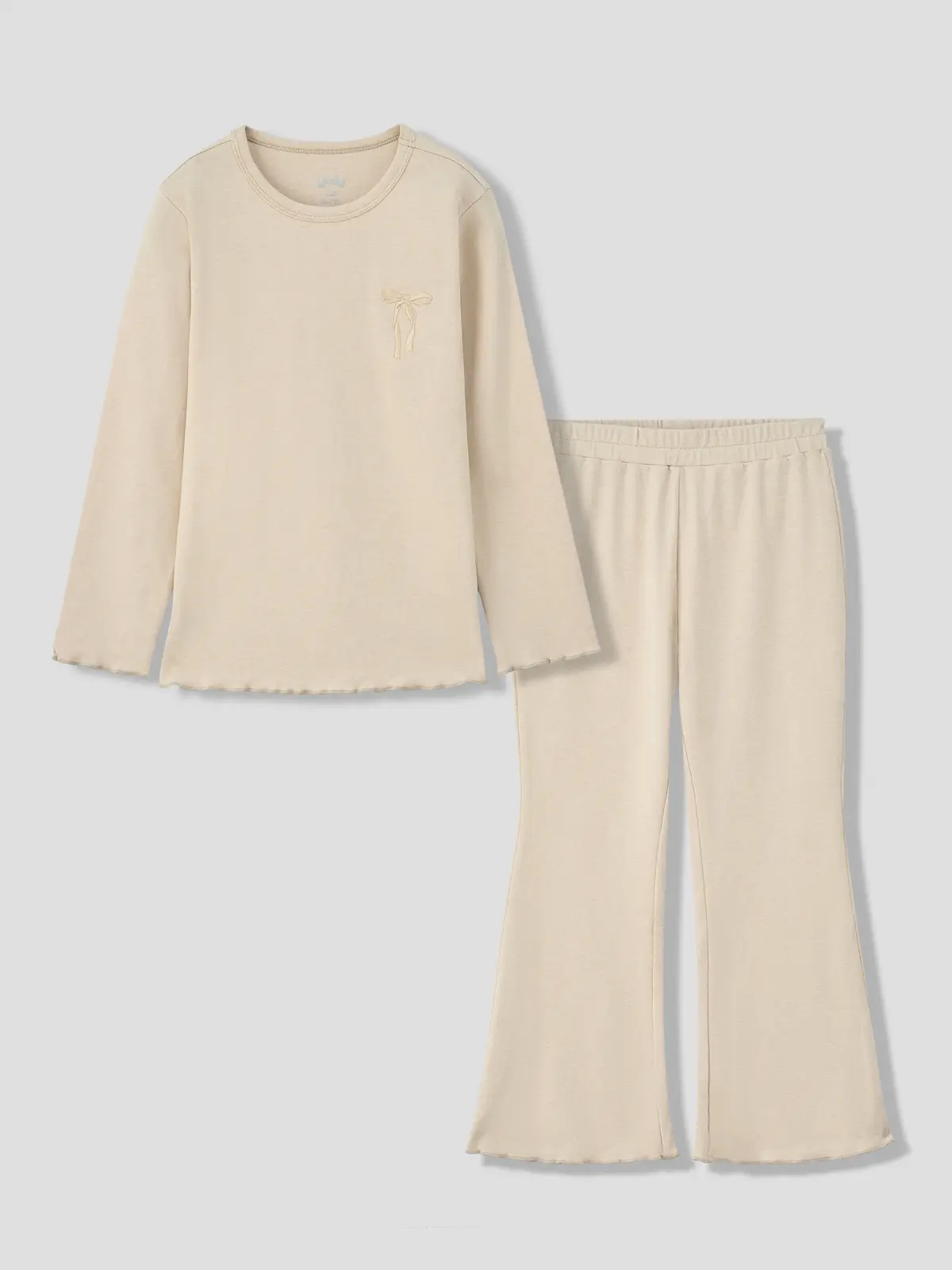 Form dáng: Bộ đồ cotton cho bé gái gồm áo form thoải mái và quần ống loe hiện đại, giúp bé trông năng động và sành điệu.