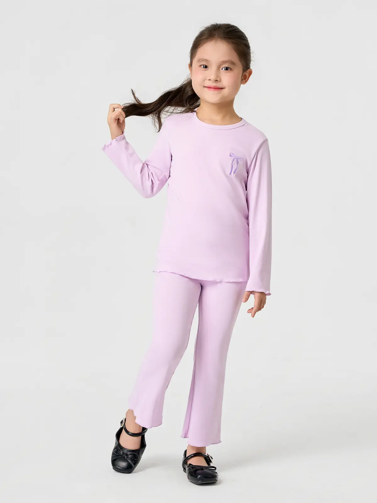 Form dáng: Bộ đồ cotton cho bé gái gồm áo form thoải mái và quần ống loe hiện đại, giúp bé trông năng động và sành điệu.