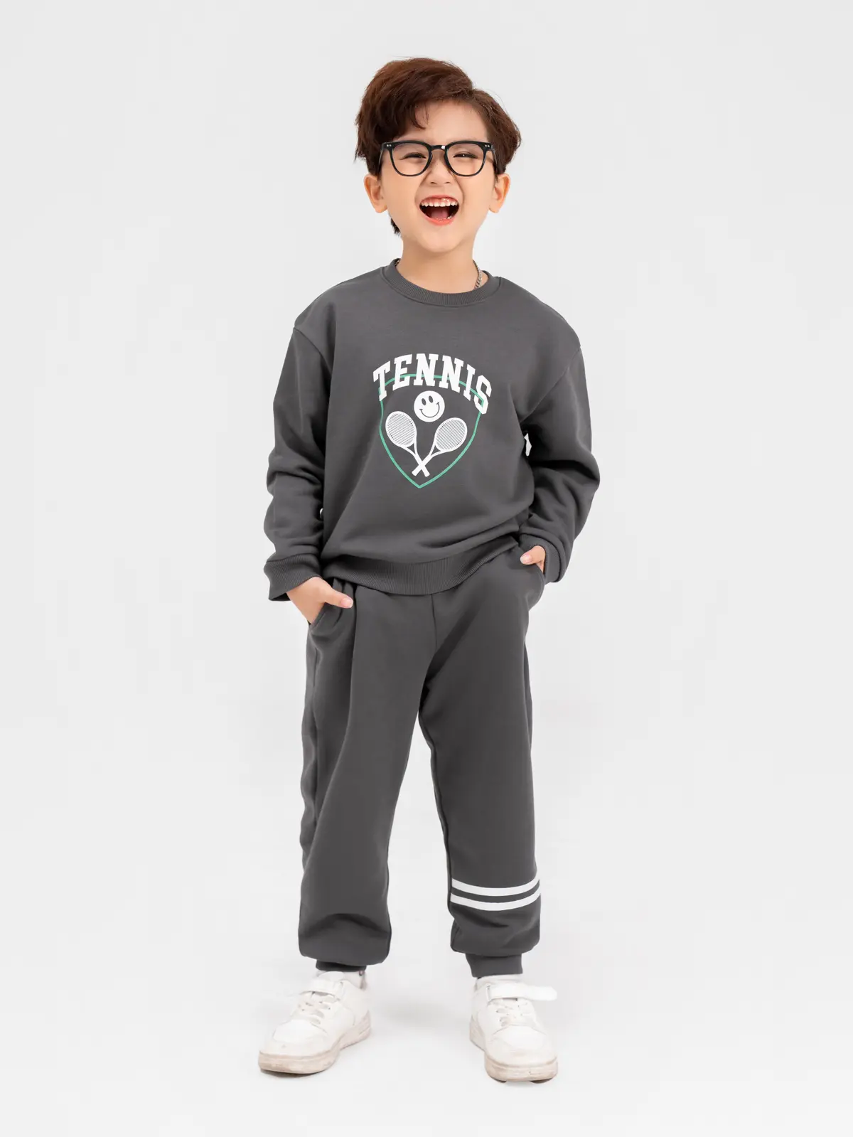 Bộ đồ co giãn nhẹ, thoải mái cho hoạt động cơ thể. Thiết kế thu đông dài tay với điểm nhấn là hình in tennis trước ngực. Chất liệu da cá dày dặn với vết cấu sợi tạo nên mặt vải đanh chắc giúp giữ ấm tốt cho bé khi mặc.