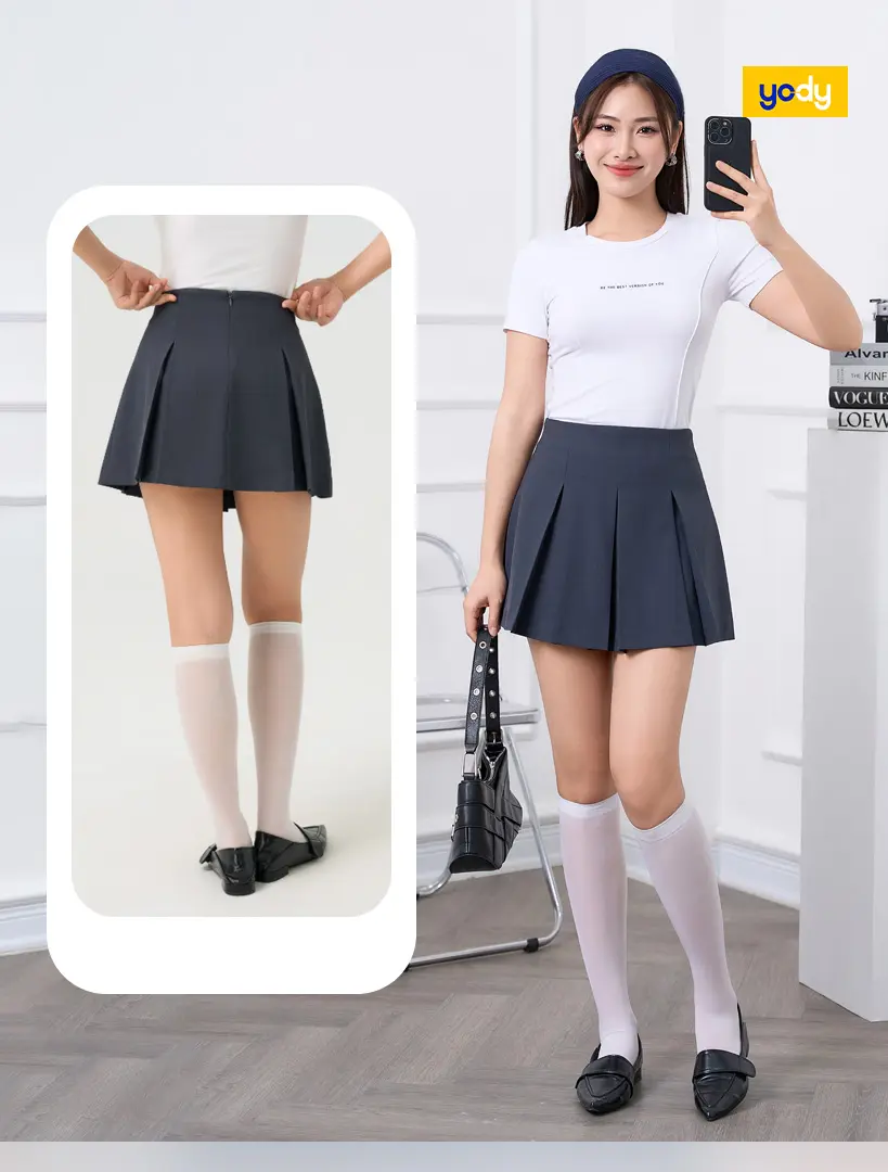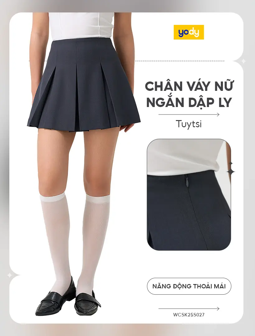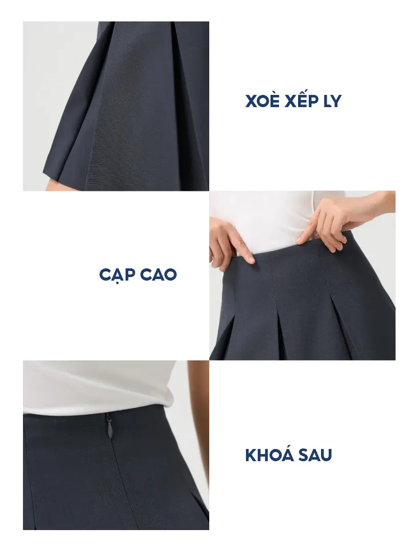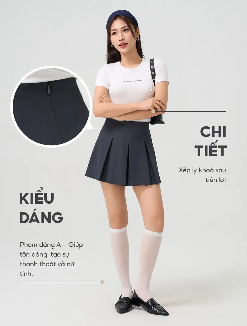 Chân váy mini xếp ly, độ xòe vừa phải: Nhờ kỹ thuật xếp ly tinh tế, váy tạo độ phồng nhẹ giúp tôn dáng và mang lại vẻ duyên dáng, nữ tính.
