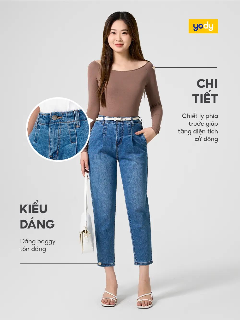 – Phần hông đánh cong, ống thu nhỏ dần về gấu – giúp che bụng, gọn đùi và tạo cảm giác chân thon dài.