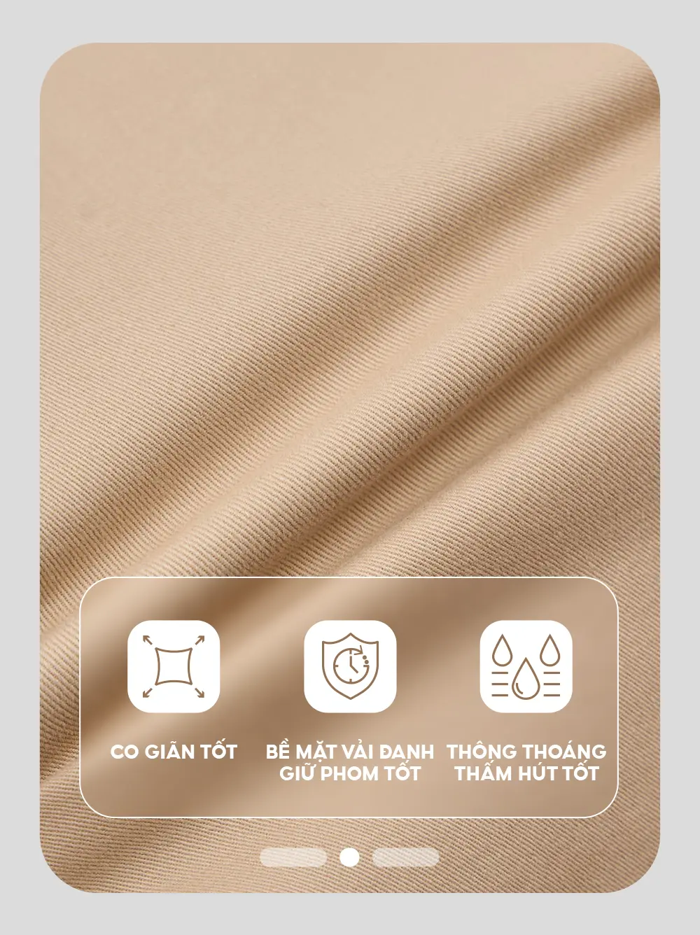 Co giãn linh hoạt, thoải mái: Thành phần spandex tạo độ co giãn nhẹ, hỗ trợ chuyển động linh hoạt và thoải mái suốt cả ngày.