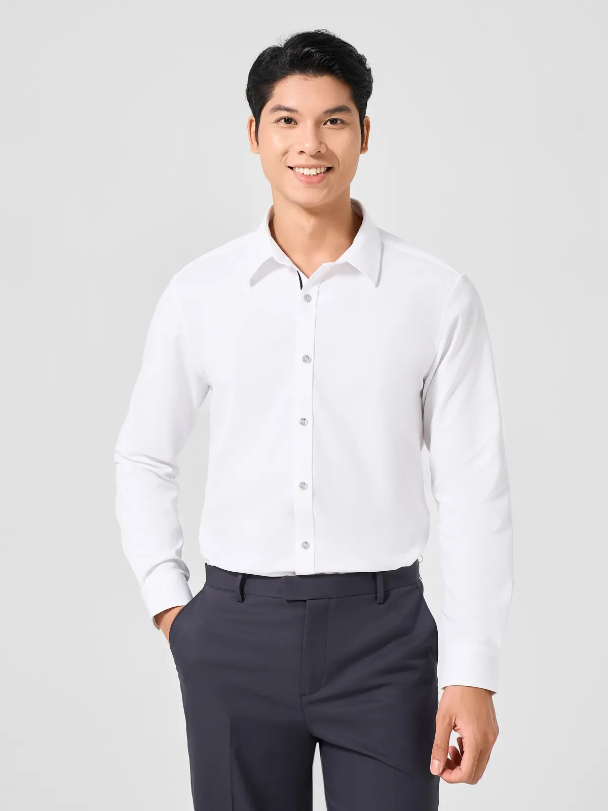 Áo sơ mi nam dài tay basic với thành phần 100% Polyester có độ co giãn tự nhiên không cần tới spandex. Thiết kế cổ điển, lịch sự phù hợp mặc đi học, đi làm, đi chơi, tham gia các sự kiện quan trọng.