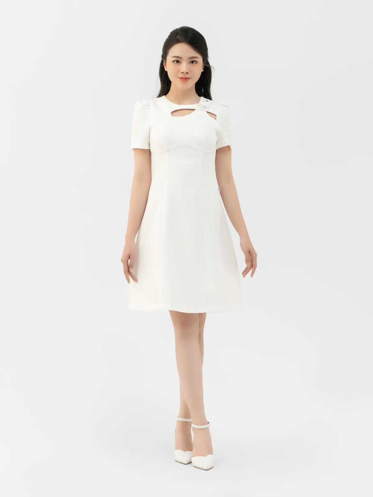 Mềm mại, nhẹ nhàng và có tính đàn hồi tốt. Cổ áo được cut out tinh tế tạo điểm nhấn trang phục. Phụ kiện đính nơ đá giúp chiếc đầm trở nên cuốn hút và quyến rũ. Dáng váy xòe giúp che đi khuyết điểm thêm phần tự tin.