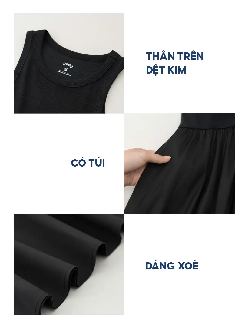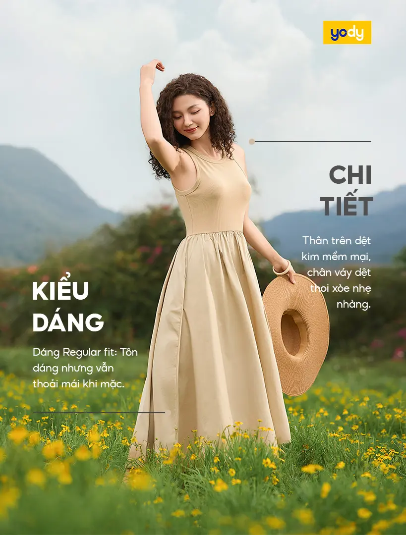 Phối chất liệu độc đáo: Thân trên dệt kim mềm mại, chân váy dệt thoi xòe nhẹ nhàng.